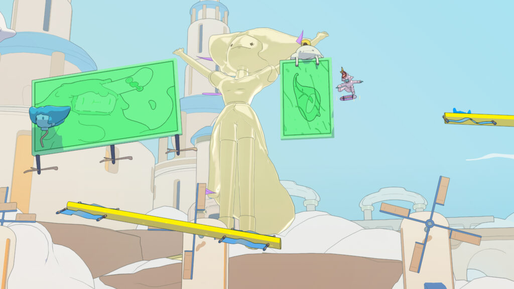 Join the fearless Radmospheric Three – Squid, Licht, and Professor Planks – unified to prevent B.B. Hopper, the business frog, from exploiting the rumored hidden city in the sky. As you traverse these incredible heights, collect map pieces that unlock the path to Radlantis, the legendary lost island built by the skate gods themselves. The tempest skate god Gail Force provides new Windzones to ride and perform the gnarliest aerial tricks. Get ready to embark on the raddest quest in OlliOlli World’s final ascending adventure: Finding the Flowzone!