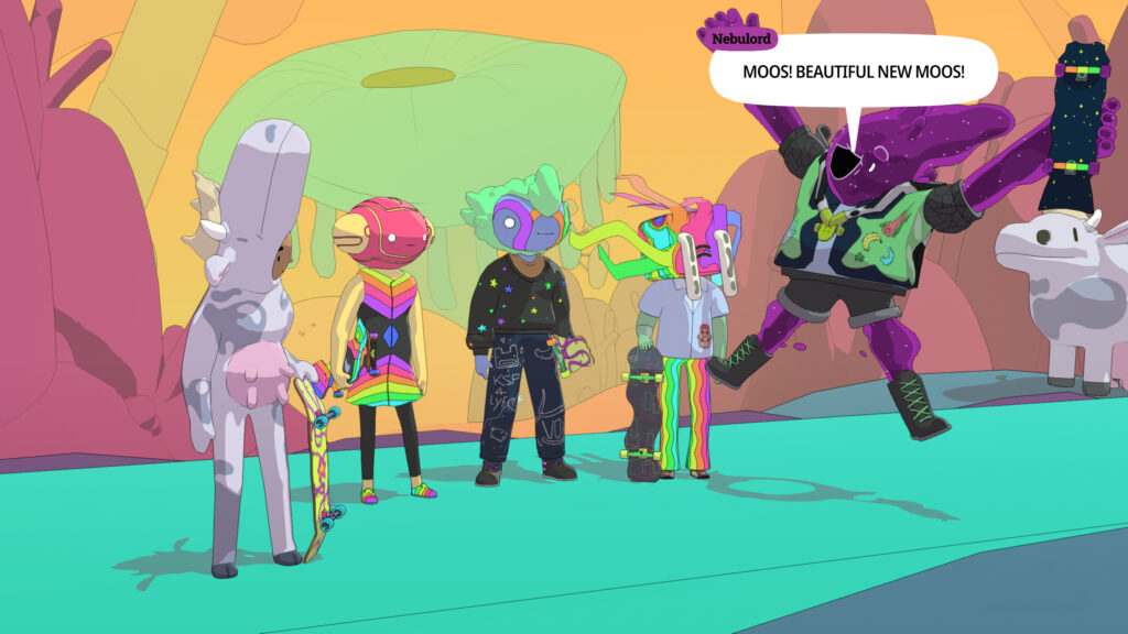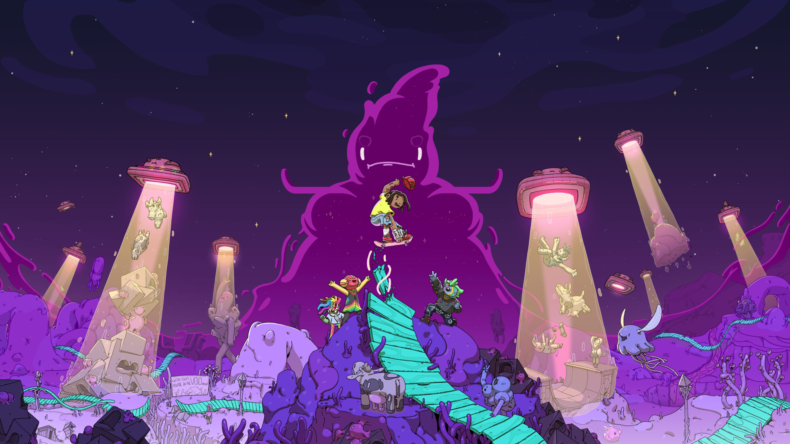 In OlliOlli World: VOID Riders you will ollie through a variety of levels with otherworldly companions and experience a completely different side of Sunshine Valley, Cloverbrook, and Burntrock. While your alien cohort retrieves skate specimens (and cows), endure the obstacles ahead to unlock the VOID Riders’ home planet: V.O.I.D. Show your true self with out of this world looks, including everything from alien streetwear to a cow onesie. There are plenty of other brand-new customization options available to transcend your personal sci-fi style including fresh emotes and slick tricks.