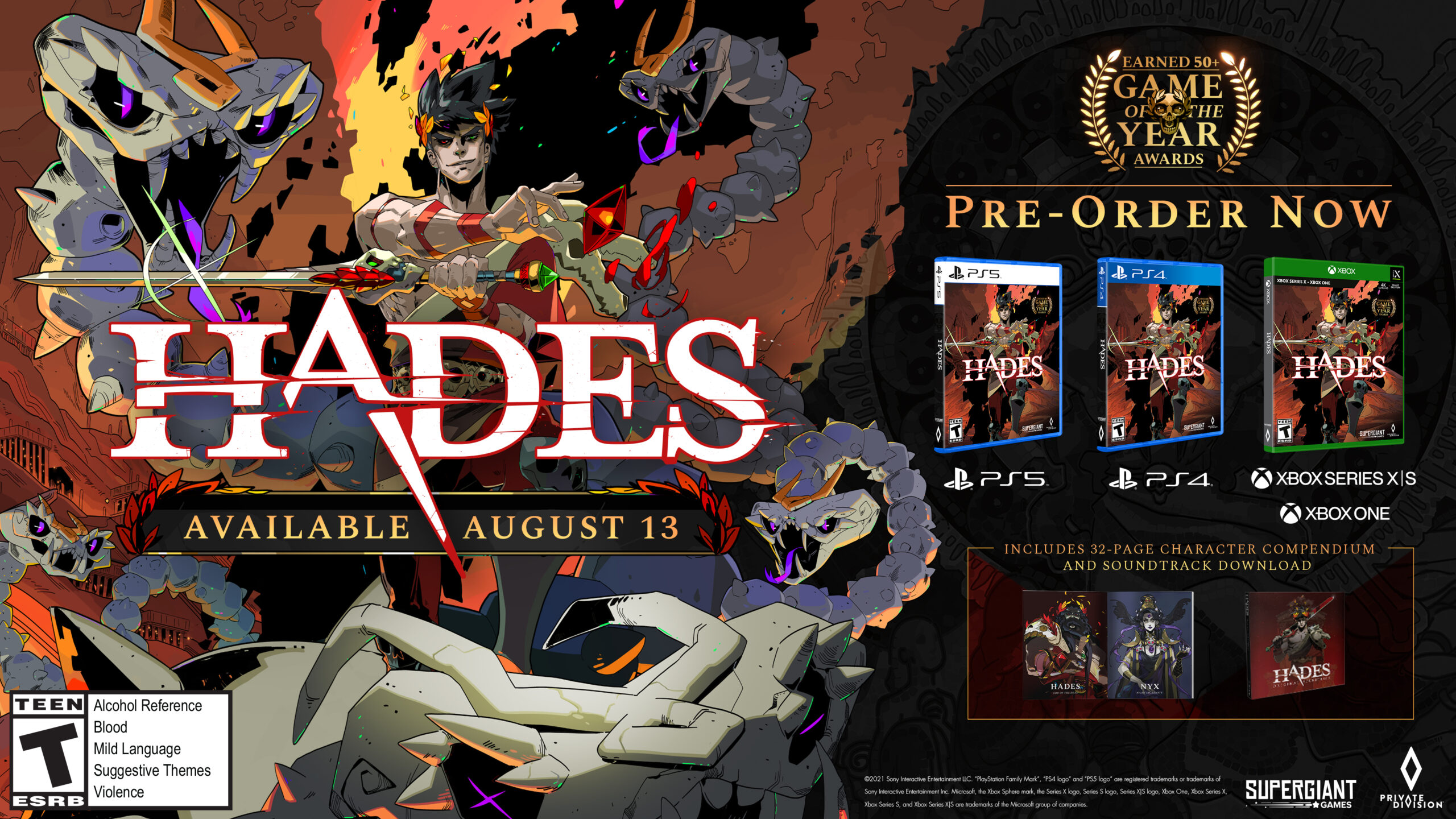 Hades will be available on PlayStation®5, PlayStation®4, Xbox Series X|S and Xbox One consoles on August 13, 2021. Physical retail versions are published by Private Division. Hades is rated T for Teen by the ESRB. For more information on Hades, subscribe on YouTube, follow on Twitter, become a fan on Facebook, join the Discord server, and visit PlayHades.com.